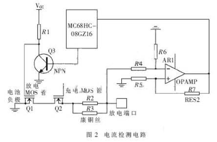 電流采樣時,電池管理系統中的參數是電池過流保護的重要依據。本系統中電流采樣電路如圖2所示。當電池放電時,用康銅絲對電流信號進行檢測,將檢測到的電壓信號經過差模放大器的放大,變為0~5 V的電壓信號送至單片機。如果放電的電流過大,單片機檢測到的電壓信號比較大,就會驅動三極管動作,改變MOS管柵極電壓,關斷放電的回路。比如,對于36 V的錳酸鋰電池來說,設定其保護電流是60 A。康銅絲的電阻是5 mΩ左右。當電流達到60 A時,康銅絲的電壓達300 mV左右。為提高精度,將電壓通過放大器放大10倍送至單片機檢測。