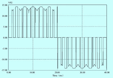 對虛擬整流波形進行斬波控制,便可以得到占空比可任意調節的PWM波形。如圖7所示,是通過SPWM控制得到的輸出波形圖。可以看出它的包絡就是虛擬整流得到的波形。