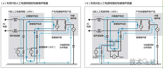 在傳導噪聲的測量中,一般針對電源線1(L1)和電源線2(L2)各自的電磁噪聲,利用V型人工電源網絡測量準峰值和平均值(a)。在該測量中,差模噪聲和共模噪聲合在一起,難以分辨哪種噪聲模式是主體。而如果利用Δ型人工電源網絡,便于分辨噪聲模式的種類(b)。該電源網絡可根據噪聲模式(Sym:差模,ASym:共模)測量其頻率特性。