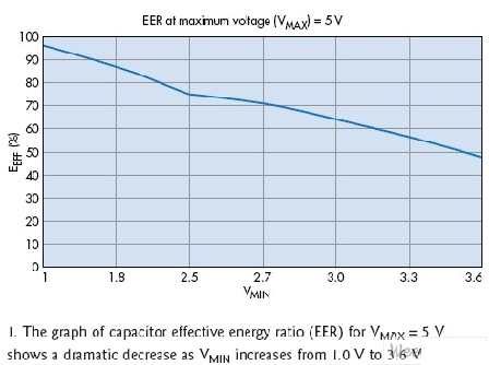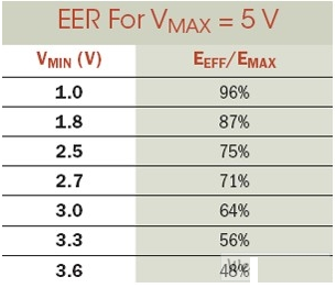 其中EMAX代表電容器存儲(chǔ)的總能量。等式2明確表明,隨著我們通過(guò)減少電容器內(nèi)的駐留電能,而降低了被供電電路的最低工作電壓VMIN,有效能效比可獲得極大地提升。對(duì)任何以電容供電的電路來(lái)說(shuō),能效比都是一個(gè)非常重要的設(shè)計(jì)考慮。