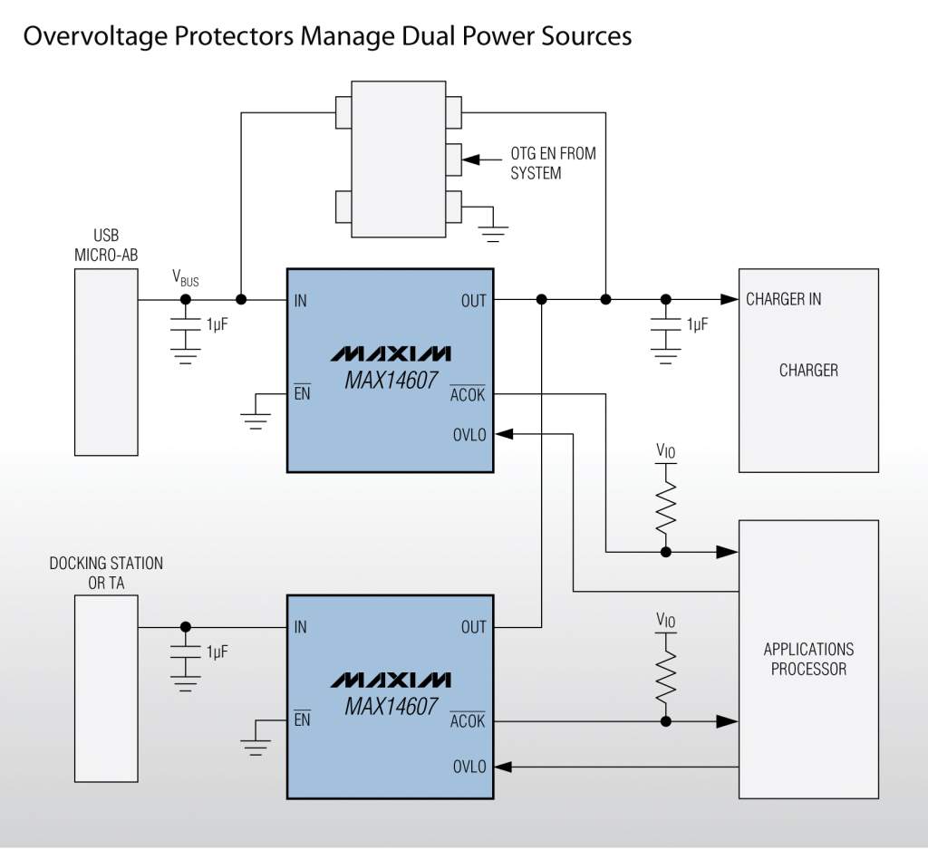 Maxim的過壓保護器采用反向偏置電路保護多電源供電便攜設(shè)備