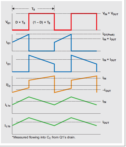 圖 3 顯示了通過各種電路組件的電流。Q1 開啟時,輸入電源的能量被存儲在L1a、L1b 和 CC 中。L1b 還提供 IOUT。Q1 關閉時,CC 持續為 L1a 提供電流,而 L1b 再次提供 IOUT。