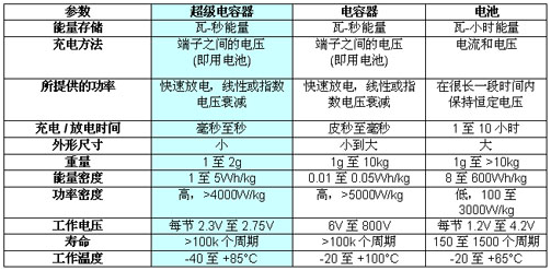 表 1:超級電容器、電容器和電池的比較