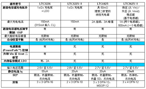 表 2 顯示了對凌力爾特超級電容器充電器系列各款器件的比較。