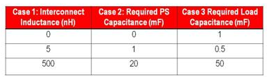 表1對舉例系統三個互連電感的要求電容器進行了比較。通過改變互連電感、計算負載旁路電容并設計電源的相應輸出級和控制環路,得到比較數據。案例1的負載和電源并列放置;案例2電源和負載之間的互連電感大小為中等。案例3中,使用線纜連接的電源的電感極高。要求旁路的多少直接與互連電感有關。