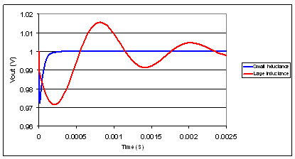 圖 2 對小和大互連電感的負載瞬態期間的輸出電壓變化模擬情況進行了比較。小電感響應快速漸次減弱,而大電感則并非如此,花費了較長的時間才穩定下來。這是由于特性阻抗更高以及諧振頻率更低。另外,如果負載電流在該諧振頻率有規律地跳動,則會出現極寬且具破壞性的電壓變化。