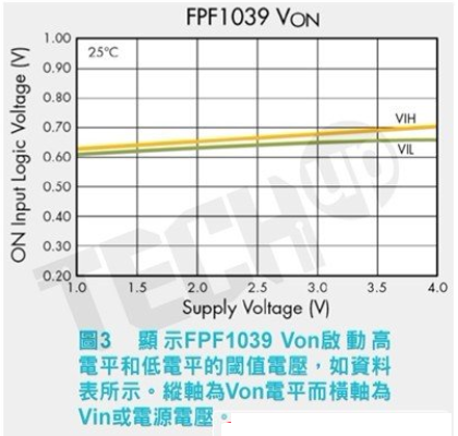 資料表中的規格增加了針對製程、電壓和溫度變化的緩衝,表明Von必須超過1.0V來開啟開關,并且必須低于0.4V來關閉開關。這帶來了非常簡單的驅動電路,可以直接連接至微處理器。此Von規格隨元件而不同且可能不一定會如圖3那樣平坦。不要停留在資料表中顯示靜態閾值電平的那一行;可以參照曲線來瞭解全部詳情。