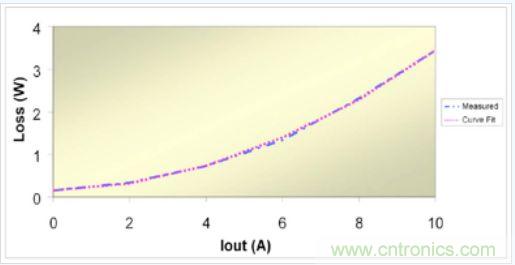 實(shí)際損耗與三項(xiàng)式之間的相關(guān)性非常好。圖 2 對同步降壓穩(wěn)壓器的測量數(shù)據(jù)與曲線擬合數(shù)據(jù)進(jìn)行了對比。我們知道,在基于求解三個聯(lián)立方程組的曲線上將存在三個重合點(diǎn)。對于曲線的剩余部分,兩個曲線之間的差異小于2%。由于工作模式(如連續(xù)或非連續(xù))不同、脈沖跳頻或變頻運(yùn)行等原因,其他類型的電源可能很難以如此匹配。這種方法并非絕對可靠,但是有助于電源設(shè)計人員理解實(shí)際電路損耗情況。