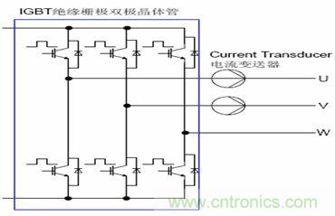 功率開關(guān)器件通過根據(jù)來自微處理器板的控制信號控制大功率輸出器件的關(guān)斷和導通,來實現(xiàn)對交流電機的輸出電流和電壓的控制。根據(jù)控制方式的不同,其輸出方式由方波輸出逐漸發(fā)展到PWM輸出或SPWM輸出。開關(guān)器件也由原來的GTR,MOSFET,發(fā)展到IGBT,IPM等。參見下面的典型IGBT逆變輸出電路。