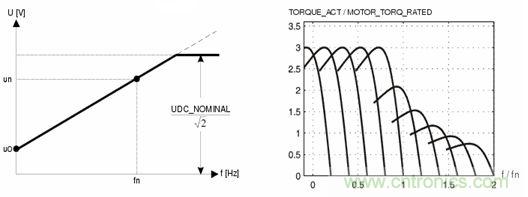 當電機在額定頻率以上調(diào)速時,逆變器的輸出頻率可以繼續(xù)升高,但是輸出端電壓只能維持在額定輸入值,此時定子磁通和調(diào)速頻率成反比下降,異步電機的工作狀態(tài)等同于直流電機的弱磁升速,電機的輸出扭矩隨磁通變化,輸出扭矩隨速度增加逐漸變小為恒功率工作模式。