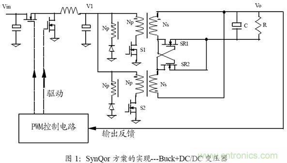 標(biāo)準(zhǔn)DC/DC 二次電源(半磚,1/4 磚)模塊,采用了Buck 與DC/DC 變壓器相級(jí)聯(lián)的兩級(jí)電路方案,如圖(1)所示。初初一看,這個(gè)方案比單級(jí)方案(如有源箝位正激電路)的元器件數(shù)要多,不太合理。但通過分析,可以發(fā)現(xiàn):其功率器件的總數(shù)并沒有增加(因?yàn)樵诘蛪捍箅娏鬏敵龅膽?yīng)用場(chǎng)合,輸出同步整流MOSFET 即使在單級(jí)方案中也要多個(gè)并聯(lián)才能實(shí)現(xiàn)效率指標(biāo));磁芯和電容元件的總面積也沒有增加(因?yàn)榭梢杂酶〉拇判竞碗娙荩5捎趦杉?jí)方案容易優(yōu)化和設(shè)計(jì),故模塊的電氣性能得到了極大的改善,具體分析見下面的介紹。