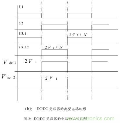 這個(gè)方案的第一級(jí)是一個(gè)同步整流Buck 變換器,它將不穩(wěn)定的輸入電壓,調(diào)整到后級(jí)DC/DC 變壓器所合適的輸入電壓,通過反饋輸出和誤差放大等,去控制Buck 變換器的PWM占空比,從而穩(wěn)定輸出。DC/DC 變壓器的電路和工作波形如圖2 所示:
