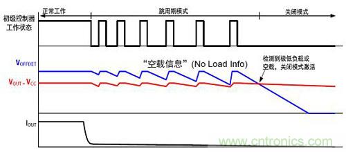 圖1是進(jìn)入關(guān)閉模式的過(guò)程。當(dāng)輸出電流從滿載慢慢降低時(shí),初級(jí)控制器會(huì)從正常工作轉(zhuǎn)換成跳周期工作,輸出電壓和空載信息基本上比較接近;當(dāng)輸入極低跳周期或關(guān)閉模式時(shí),輸出空載電壓將低于輸出電壓,從而檢測(cè)到極低負(fù)載或空載,激活關(guān)閉模式。