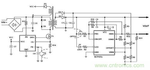 NCP4354是專為與NCP1246配合使用而設(shè)計(jì)的一款低待機(jī)能耗次級(jí)端恒流恒壓 (CCCV) 控制器,帶有LED驅(qū)動(dòng)器 (圖3)。其價(jià)值在于,可檢測(cè)空載條件并使主控制器進(jìn)入超低頻率跳周期模式,以降低待機(jī)功耗;只有一個(gè)反饋和關(guān)閉(OFF)控制所需的光耦;提高了空載效率(小于15 mW);元件更少。此外,它還具有CCCV反饋和LED驅(qū)動(dòng)器、供電電壓高達(dá)36 V、在關(guān)機(jī)模式可調(diào)整最低Vout、1.25 V參考精度為1%,以及Icc大于100 μA等特性。NCP4354與NCP1246一起使用,可調(diào)節(jié)Vmin,市場(chǎng)及應(yīng)用范圍包括筆記本電腦適配器及其他外部電源適配器。NCP435x系列還有一款不帶LED驅(qū)動(dòng)器的產(chǎn)品NCP4353,可以與NCP1246一起使用來(lái)調(diào)節(jié)Vmin(僅B版本)。