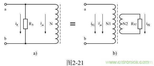 圖2-21-a中,Rb為渦流損耗等效電阻,N為變壓器初級線圈。由此可以看處,由于受渦流損耗的影響,變壓器鐵芯被磁化時,相當于一個渦流損耗等效電阻Rb與變壓器初級線圈N并聯。