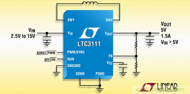 【導讀】凌力爾特推出同步降壓-升壓型轉換器 LTC3111,該器件可在很寬的電源范圍內工作,包括單節或多節電池、超級電容器組和交流適配器,提供高達 1.5A 輸出電流。15V 輸入和輸出、1.5A 單片同步降壓-升壓型 DC/DC 轉換器,效率高達 95% 并可以低噪聲工作。