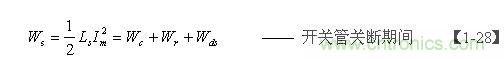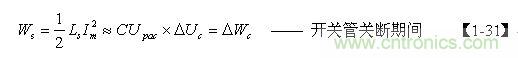 如果不考慮電阻R對(duì)電容器C充電時(shí)產(chǎn)生的分流作用,以及開(kāi)關(guān)管由導(dǎo)通到完全關(guān)斷期間漏極電流(逐步減小)對(duì)電容器C充電時(shí)產(chǎn)生的分流作用,即:Wr=0 、Wds=0 ,則【1-28】式可以改寫(xiě)為: