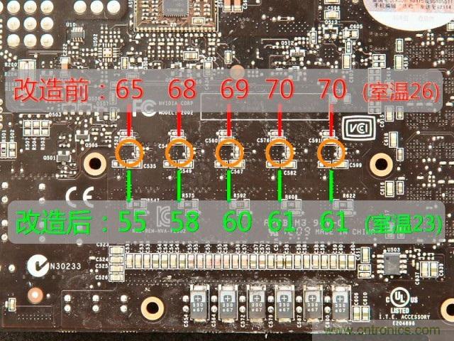 看下改造前后的供電模塊溫度吧,使用紅外測溫槍對準(zhǔn)供PCB背面供電模塊的位置分別取5個(gè)測量點(diǎn),測試使用FC2的benchmark tool連續(xù)運(yùn)行25分鐘后進(jìn)行溫度采集。沒有空調(diào),室溫不固定,沒有辦法,不過還是能看出改造后供電模塊的溫度的確有明顯的下降,刨去室溫的差距后應(yīng)該還能有5度以上的溫差。另外溫度的下降在另一個(gè)方面說明供電模塊的效率提升,只是忙著改造忘記在之前測一下功率了,個(gè)人感覺應(yīng)該能省5瓦左右的功率吧。