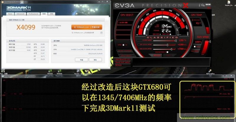 同時(shí),改造以后在原裝散熱器條件下,可以以1345MHz的核心頻率完成3D Mark11測試,取得x4099的高分。而在改造之前雖然也能用1345MHz跑完測試,不過跑的不是特別順利,得跑幾次才能過一次。這應(yīng)該是通過改造降低了供電紋波電流的功勞,可惜手邊沒有示波器,要不就能量化一下改造的效果了。