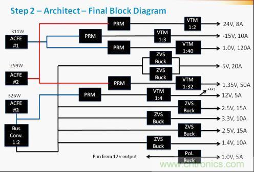 構建系統的第一個步驟是創建一個電源系統的方框圖,從輸出開始,然后向輸入后向推進。從最低功率級別開始它的運作更好,并從那里繼續工作,以便可以審查功率元件類別,并隨功率級別的增加在必要時做出改變。