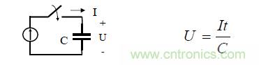 1. 當一電流流經電容, 電容兩端的電壓逐漸增加, 并且電容量越大電壓增加越慢。