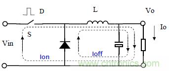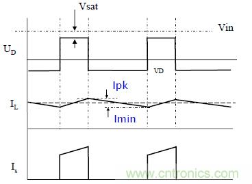 在這階段,電流波形是一條斜率為負的斜線,斜率為-Vout/Lo。當開關再次導通時,二極管迅速關斷,電流從輸入電源和開關管流過。在開關導通前瞬間,電感上的電流Imin就是開關管通過的初始電流。