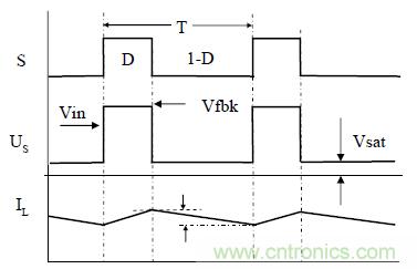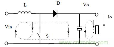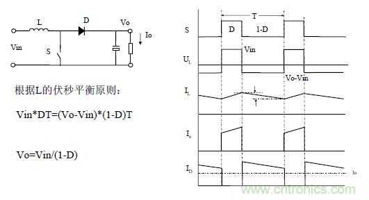 升壓變換器與BUCK變換器有著相同的組成部份,只是它們的位置被重新布置了一下。新的布局使變換器與正激式變換器的工作過程完全不同。在這種情況下,開關管導通時,電流環路僅在包括電感,開關管和輸入電壓源。在這段時間中,二極管是反向阻斷的。電感電流波形也是以固定斜率上升,可用下式描述: