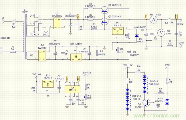 圖:簡單易制、低廉高效的0-30V/10A可調穩壓電源電路原理