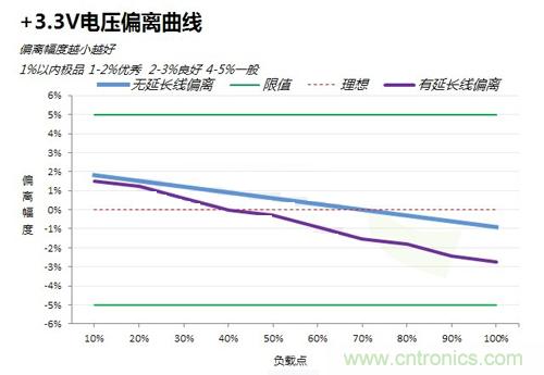 然后看下電源電壓偏離對比,可以發現在加入了延長線之后,電源的電壓也有一定程度的影響。其中+12V影響較大,+5V和+3.3V影響較小。