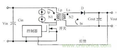 反激開關電源的工作原理可概括為:功率管開啟時,變壓器只存儲能量,不對次級提供能量;關斷后,變壓器將能量向次級釋放,電路拓撲如圖1所示。它具有電路簡單(節省一個大電感)、不怕負載短路等優點,但由于鐵芯處于單向磁化狀態,為防止磁飽和,需要大鐵芯,也就意味著大體積,故廣泛應用于100—150W的中小功率開關電源。