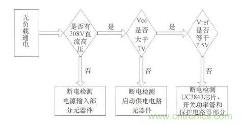 檢修電源首先要檢查在斷電狀態下有無明顯的短路、元器件損壞故障。打開電源的外殼,檢查保險絲是否熔斷,再觀察電源的內部情況,如果發現電源部分的元件破裂,則應重點檢査此元件,一般來講這是出現故障的主要原因,嗅一下電源內部是否有糊味,檢查是否有燒焦的兀器件,問一下電源損壞的經過,這一點對于維修任何設備都是必需的。在初步檢査以后,還要對電源進行更深人的檢測,具體步驟可參考圖4。