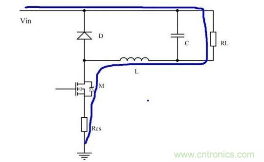 接下來的開關周期內,電感通過二極管D續(xù)流,如圖3所示。這就出現(xiàn)了一個問題,此時的電流不再流經(jīng)開關管,控制電路無法知道電流下降到何種程度了。