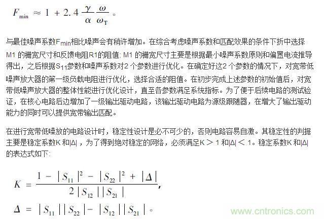③ M1 的溝道熱噪聲被反饋電路降低,在寬頻帶范圍內實現噪聲系數NF<3. 6 dB。通過分析小信號模型和噪聲系數,得到該結構的輸入阻抗為: