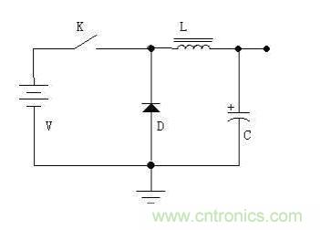 開關電源是一種比較新型的電源。它具有效率高,重量輕,可升、降壓,輸出功率大等優點。但是由于電路工作在開關狀態,所以噪聲比較大。 通過下圖,我們來簡單的說說降壓型開關電源的工作原理。如圖所示,電路由開關K(實際電路中為三極管或者場效應管),續流二極管D,儲能電感L,濾波電容C等構成。當開關閉合時,電源通過開關K、電感L給負載供電,并將部分電能儲存在電感L以及電容C中。由于電感L的自感,在開關接通后,電流增大得比較緩慢,即輸出不能立刻達到電源電壓值。一定時間后,開關斷開,由于電感L的自感作用(可以比較形象的認為電感中的電流有慣性作用),將保持電路中的電流不變,即從左往右繼續流。這電流流過負載,從地線返回,流到續流二極管D的正極,經過二極管D,返回電感L的左端,從而形成了一個回路。通過控制開關閉合跟斷開的時間(即PWM——脈沖寬度調制),就可以控制輸出電壓。如果通過檢測輸出電壓來控制開、關的時間,以保持輸出電壓不變,這就實現了穩壓的目的。