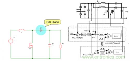 因為SiC器件的特性,SiC二極管的反向恢復時間接近0,因此開關損耗很低。將SiC用于PFC中可以帶來的好處是:高頻化、在較高的開關頻率下依然可以得到較低的開關損耗,電感的體積可以減小,同時還提高了功率密度。