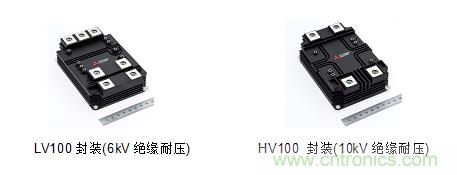 首次亮相展會的X系列雙管HVIGBT模塊,采用CSTBTTM 結構的第7代IGBT和RFC二極管,降低功率損耗;運用可降低內部電感的封裝技術,優化產品性能;使用兩種封裝(LV100/HV100),實現兩種絕緣耐壓(6kV/10kV),但兩者具有相同的外形尺寸。LV100封裝包括900A/1.7kV和450A/3.3kV;HV100封裝包括450A/3.3kV、330A/4.5kV和225A/6.5kV;可提高系統結構設計的靈活性,方便實現逆變器擴容。