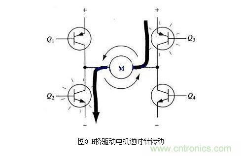 圖3所示為另一對三極管Q2和Q3導(dǎo)通的情況,電流將從右至左流過電機。當(dāng)三極管Q2和Q3導(dǎo)通時,電流將從右至左流過電機,從而驅(qū)動電機沿另一方向轉(zhuǎn)動(電機周圍的箭頭表示為逆時針方向)。
