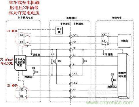 1)在充電過程中,非車載充電機控制裝置通過對檢測點1的電壓進行檢測,如果判斷