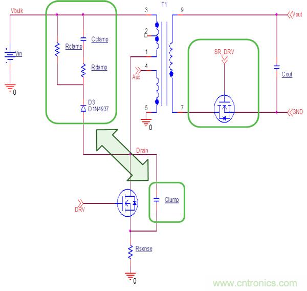 準諧振模式允許使用相對大的緩沖電容Clump,額外增加的Clump (10-22pF)可以減少MOS管關斷損耗,減少電磁干擾(EMI)。準諧振反激有利于次極端加SR,可降低整流二極管導通損耗,減少次極端整流管尖峰電壓,降低其耐壓要求。