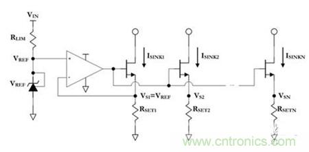 晶體管)源電壓VS以及RSET電阻決定著各柱上的灌電流(sink current);通過(guò)去除來(lái)自外部電流沉柱的反饋(即所有N》1),已失去對(duì)VSN的直接控制。因此,RSETN必須精心選擇以生成預(yù)期的任意第N個(gè)柱的灌電流,即ISINKN。仔細(xì)觀察上面的圖1,很容易得出定義偏置網(wǎng)絡(luò)第N個(gè)柱電流與第1個(gè)柱電流的比值的等式︰
