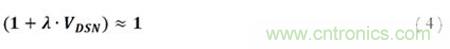 必須注意的是,這里可以很大程度上忽略通道寬度調(diào)制的影響。這是因?yàn)槿魏我蚵O電壓上升導(dǎo)致的漏極電流的上升會(huì)在通過(guò)RSET電阻后下降,并導(dǎo)致源電壓的上升。為了使MOSFET能維持任何電流,柵極電壓必須大于源電壓與閾值電壓的和。也就是說(shuō),給定一個(gè)柵極電壓,源電壓將被限制在至少比柵極電壓小一個(gè)閾值電壓的值,且再大的漏極電壓上升也不會(huì)提升漏極電流。因此,構(gòu)建相應(yīng)運(yùn)行條件,RSET必須足夠大,從而確保在上述限制下可允許作出以下假設(shè):