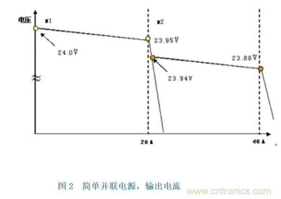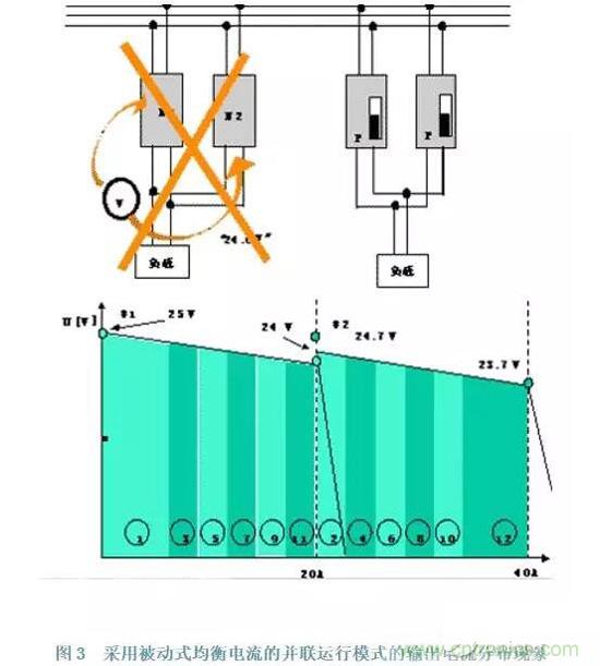 被動式均衡電流的并聯運行模式特點是:當輸出電流增大時,其輸出電壓會微量的減少,其輸出電壓是所謂的軟特性:輸出電壓隨著輸出電流的增加而稍微下降。其電源在空載到滿負載之間的輸出電壓的波動大約為4%~5%額定電壓即1V左右。這樣當二個電源并聯時,由于不同的電流負載產生了不同的輸出電壓,一個是有稍高輸出的電壓的電源首先承受負載電流,隨著電流量的增加,這個電源輸出電壓略降,低于另一個電源的輸出電壓,這樣另一電源承受負載電流,通過這樣階梯式交替的方法達到均衡電流的作用。均衡電流的平衡程度如何,取決于所有并聯電源的輸出電壓的初始調節(jié)和設置值。必需指出,這個方法的實現其輸出電源必須采用一個共同的接線端。