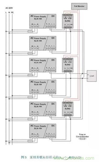 圖5表示了一個采用PULS電源實現的5+1的冗余電源的方案。其輸出功率為3 600W/24V/150A的并聯式冗余電源。這個方案采用了6個SL30.100和3個SLR02的冗余模塊。3個SLR02的冗余模塊將所有的電源工作狀態(tài)串接起來,成為一個綜合信號送入控制系統(tǒng)進行監(jiān)控。每個SLR02的冗余模塊都能顯示所連接的電源工作狀態(tài),隔離二極管也防止了輸出回路的短路現象的出現。