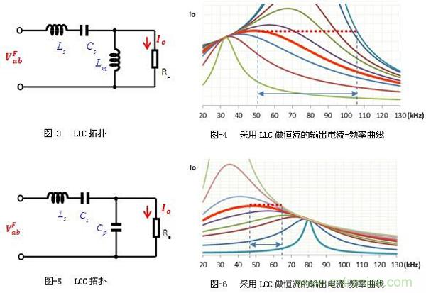兩圖中虛線是恒流軌跡線,當(dāng)負(fù)載電阻變化時,工作頻率需要做相應(yīng)的變化使得電流保持穩(wěn)定不變,從圖-4中可以看出,采用LLC拓?fù)鋵崿F(xiàn)恒流輸出時,不同負(fù)載線之間的間隔較大,意味著頻率變化較大。而從圖-6中可以看出,采用LCC拓?fù)鋵崿F(xiàn)恒流輸出時,不同負(fù)載線之間的間隔比較緊密,意味著頻率變化較小。也就是說,LCC拓?fù)鋵崿F(xiàn)恒流時,頻率隨負(fù)載變化的范圍比LLC的要小很多。