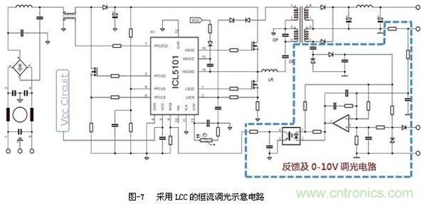 圖-7是LCC拓?fù)浣Y(jié)構(gòu),采用次級電流采樣做恒流反饋,并能實現(xiàn)0-10V調(diào)光的示意電路。PFC開關(guān)管采用了英飛凌的高性價比P6系列CoolMOSTM IPD60R190P6,LCC開關(guān)管采用英飛凌針對消費市場的低成本CE系列CoolMOSTM IPD60R650CE。兩個型號均為TO-252貼片封裝,無散熱器,整體電路非常簡潔。