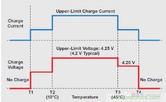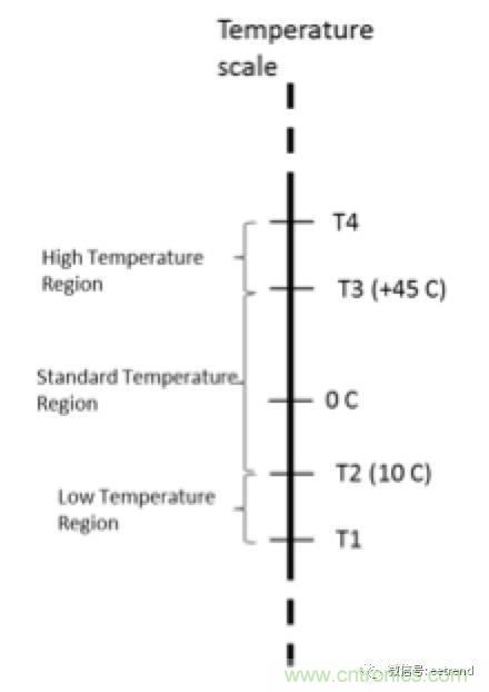 如圖1所示,JEITA規范定義了最低溫度(T1)、最高溫度(T4)和位于二者之間的三個溫度區(低、中、高),以確保充電安全。