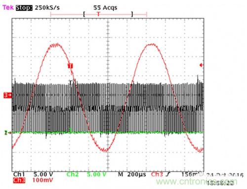 直列式電流感應(yīng)方法看似是最合理的,因為這是最終要測量的電流。但這種方法存在一個問題。驅(qū)動MOSFET或IGBT的PWM信號對電流感應(yīng)放大器造成嚴重破壞。感測電阻處的共模信號從電源電壓被驅(qū)動到接地,具有非常快速的瞬態(tài)開關(guān)特性,而電流感應(yīng)放大器試圖測量感測電阻本身的小差分信號。圖2是由PWM逆變器產(chǎn)生的正弦相電流(紅色波形)的示波器截圖。這種情況下,PWM頻率為100兆赫(MHz),由LMG5200 GaN半橋功率級提供(更多詳細信息,請參見底部的TI設(shè)計)。需要注意的是,快速開關(guān)信號是直列式電流感應(yīng)放大器測量相電流時所接收的信號。這就像在有颶風(fēng)的情況下,當(dāng)杯子在海上漂浮,而試圖測量杯中液體一樣。難怪大多數(shù)設(shè)計師會考慮使用低側(cè)感應(yīng)!下面我們將介紹另外一種方法。