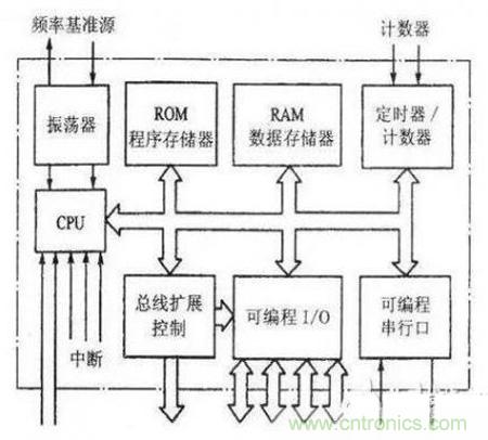 Ⅰ:中央處理器CPU,包括運算器、控制器和寄存器組。是MCU內部的核心部件,由運算部件和控制部件兩大部分組成。前者能完成數據的算術邏輯運算、位變量處理和數據傳送操作,后者是按一定時序協調工作,是分析和執行指令的部件。