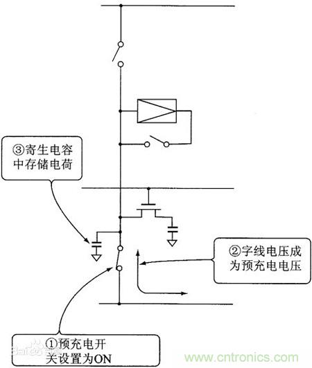 寫操作時,寫選擇線為“1”,所以Q1導通,要寫入的數據通過Q1送到Q2的柵極,并通過柵極電容在一定時間內保持信息。