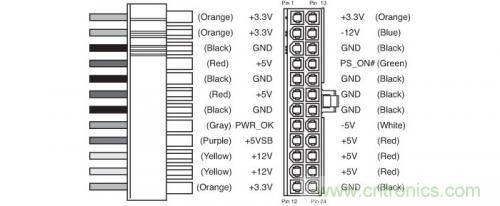 主板上的24pin供電接口就用到了PC電源上全部5種供電電壓,即+12V、+3.3V、+5V、-12V以及+5VSB,另外還有一個-5V,不過這個電壓對應的硬件和接口實際上早已淘汰,因此現在的PC電源已經不再提供-5V供電,在24pin接口中的這一路僅是名義上的存在。